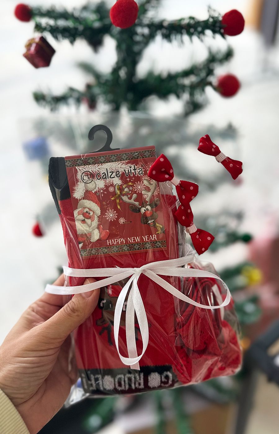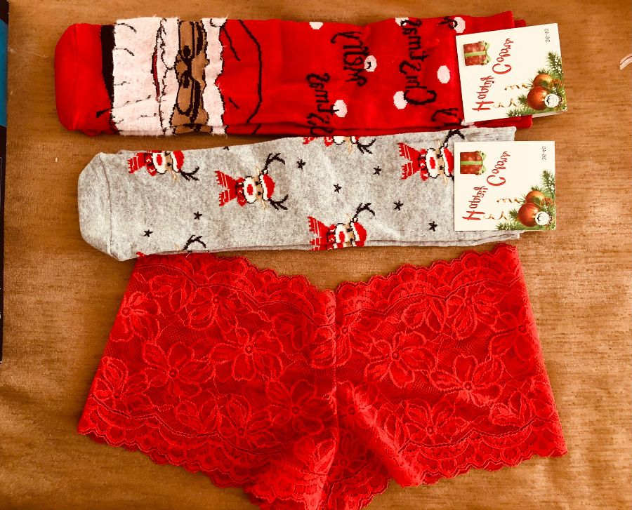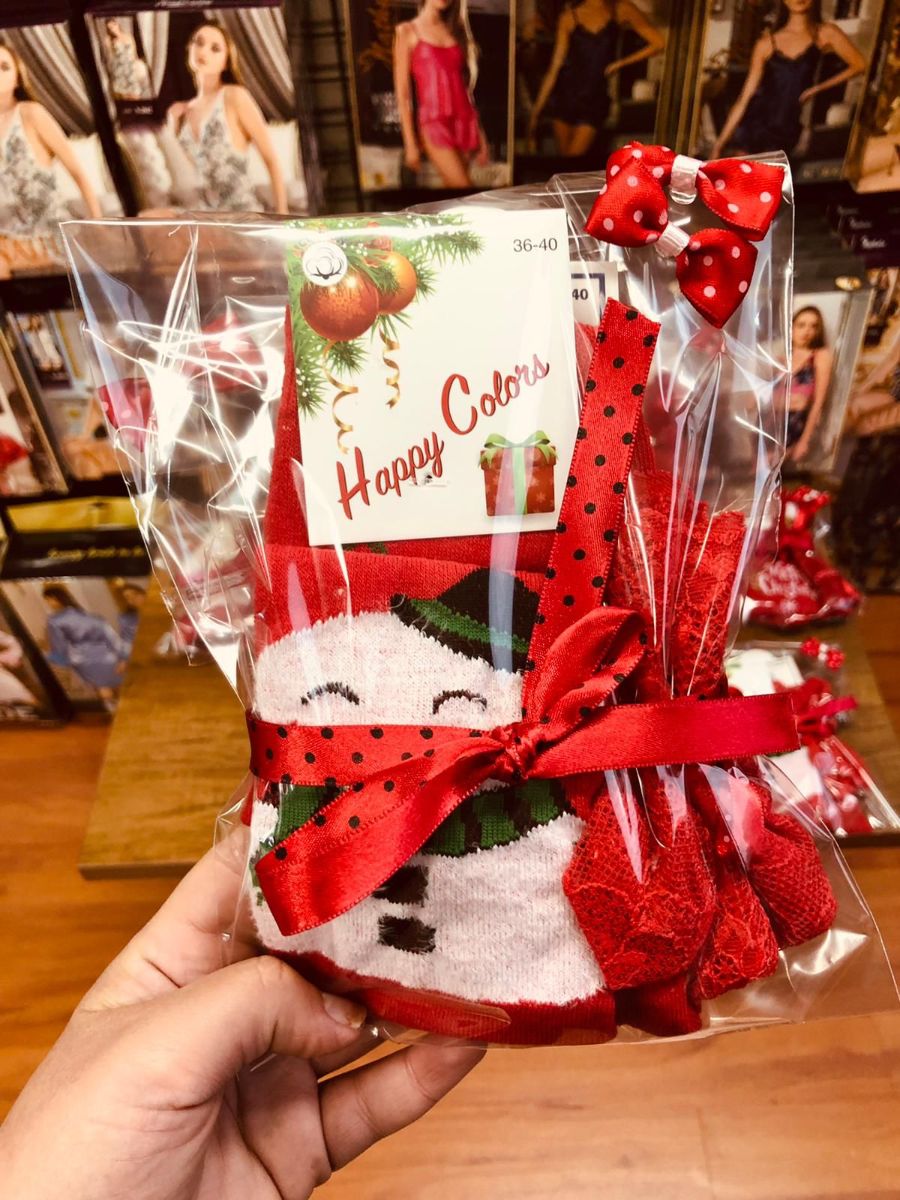 İçerisinde 2 adet 36-40 numara unisex uzun yılbaşı çorap, 1 adet likralı kırmızı kilot vardır.
